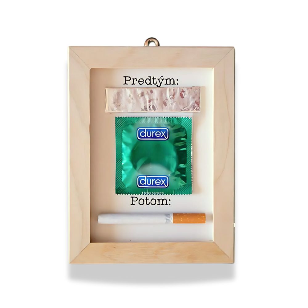 •Drevený obrázok s žuvačkou, prezervatívom a cigaretou. Rozmer ca. 15 x 12 cm.