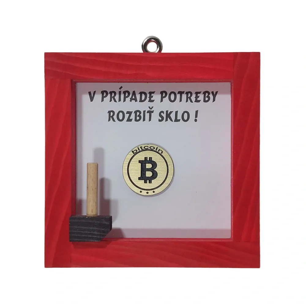 Humorný zavesovací obrázok "V prípade potreby rozbiť sklo" s kryptomenou BITCOIN.