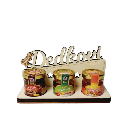 Darčeková sada obsahuje pečený čaj, včelí med a čokoládový krém na ozdobnom stojane vyrobenom z dreva.