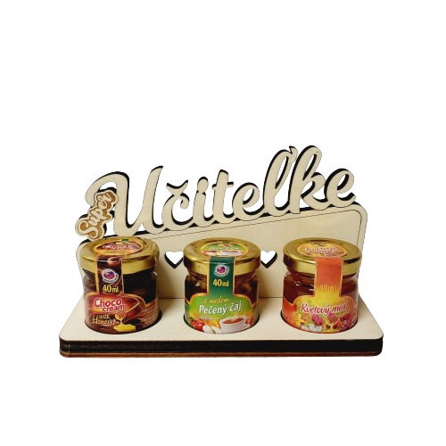 Darčeková sada obsahujúca pečený čaj, včelí med a čokoládový krém na ozdobnom stojane z dreva.