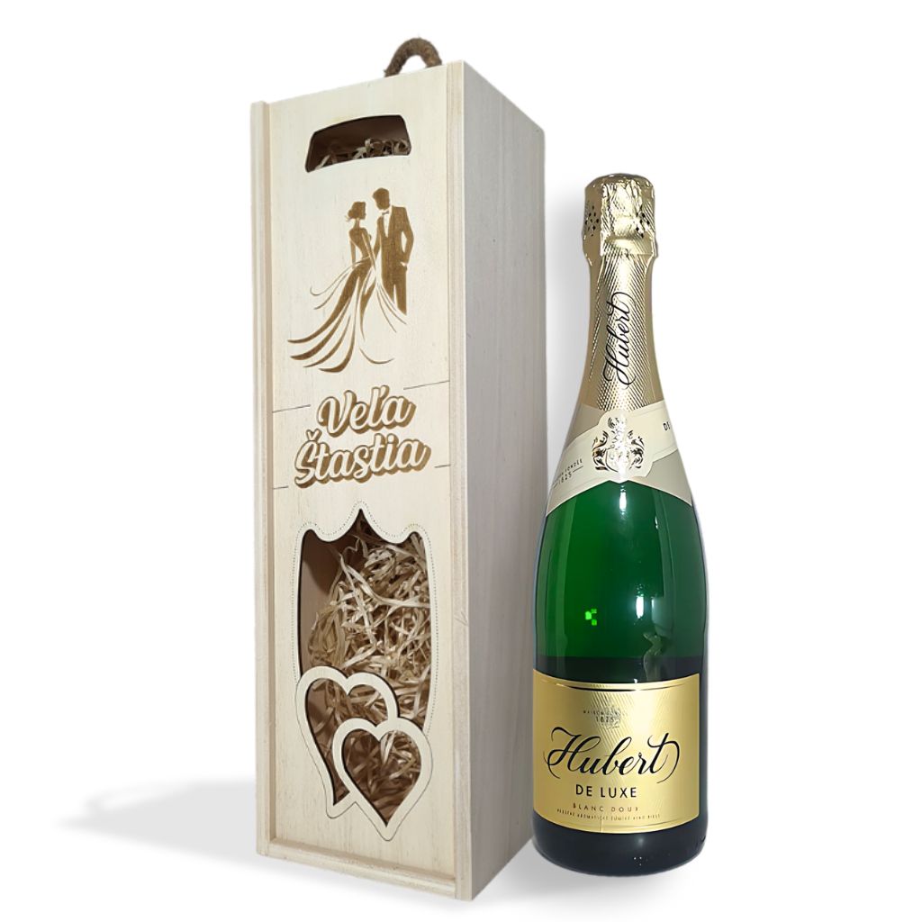 Ďalšie kľúčové slová: svadobná darčeková krabička, drevená kazeta na víno, darček pre svadobčanov, luxusné balenie na šampanské, obal na svadobný dar, štýlové balenie na alkohol.