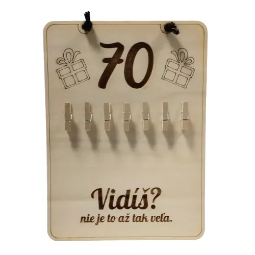 Originálny narodeninový darček, ktorý zaručene pobaví! Naša drevená tabuľa so štipcami je navrhnutá tak, aby ste na štipce zavesili bankovky a vyskladali vek oslávenca. S nápisom 'Vidíš, nie je to až tak veľa' pridáte k daru aj vtipný odkaz. Ideálny spôsob, ako osláviť narodeniny s humorom a kreativitou!