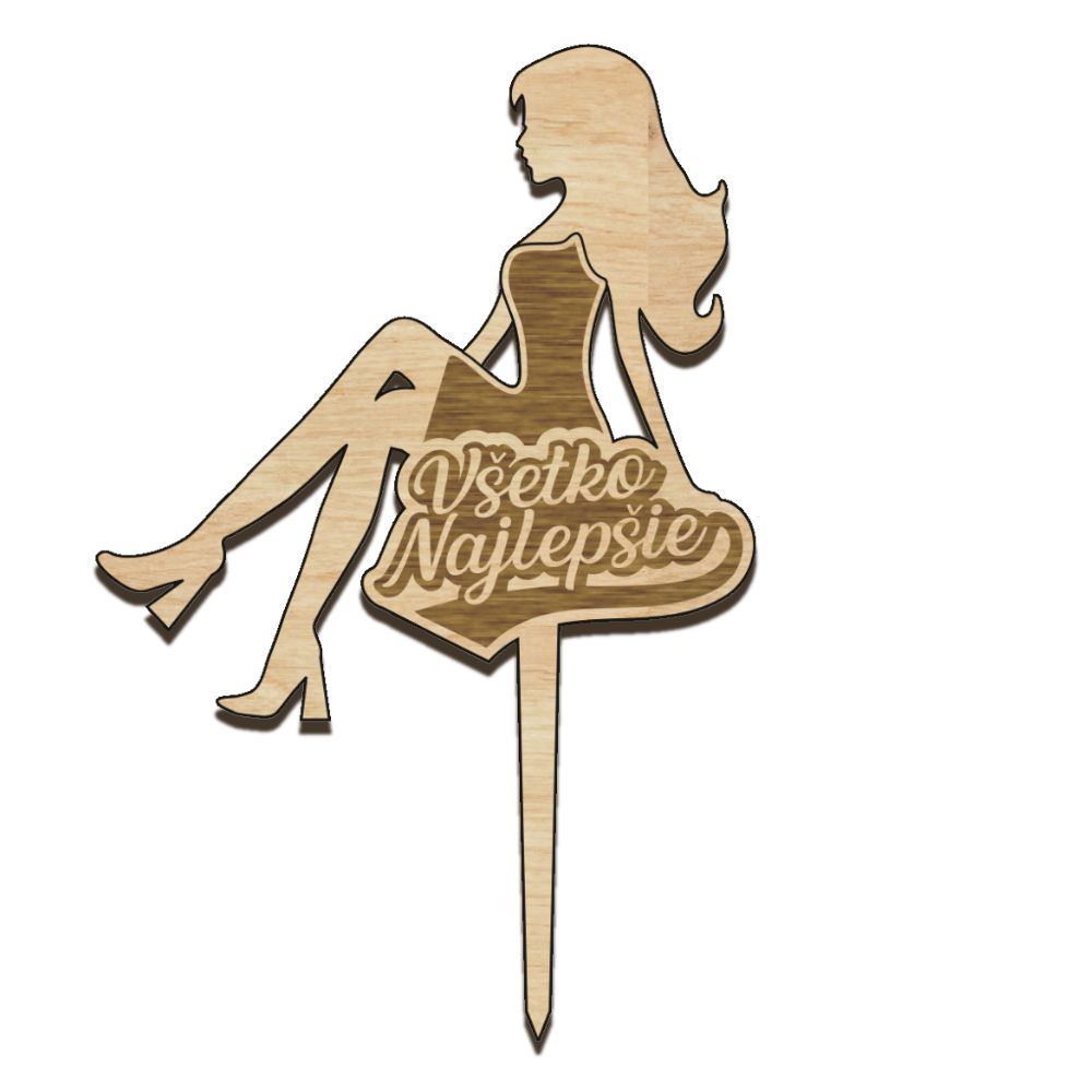 Drevená zapichovačka s nápisom „Všetko najlepšie“ a ženskou siluetou. Ideálna na dotvorenie narodeninovej torty, darčeka alebo kytice.